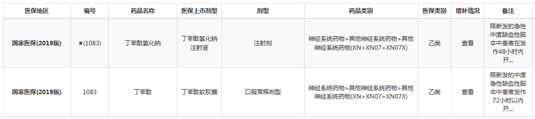 目前,丁苯酞软胶囊及注射液均进入2019年国家新版医保乙类目录。
