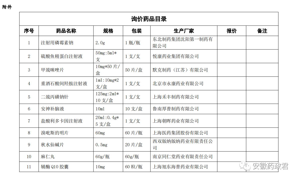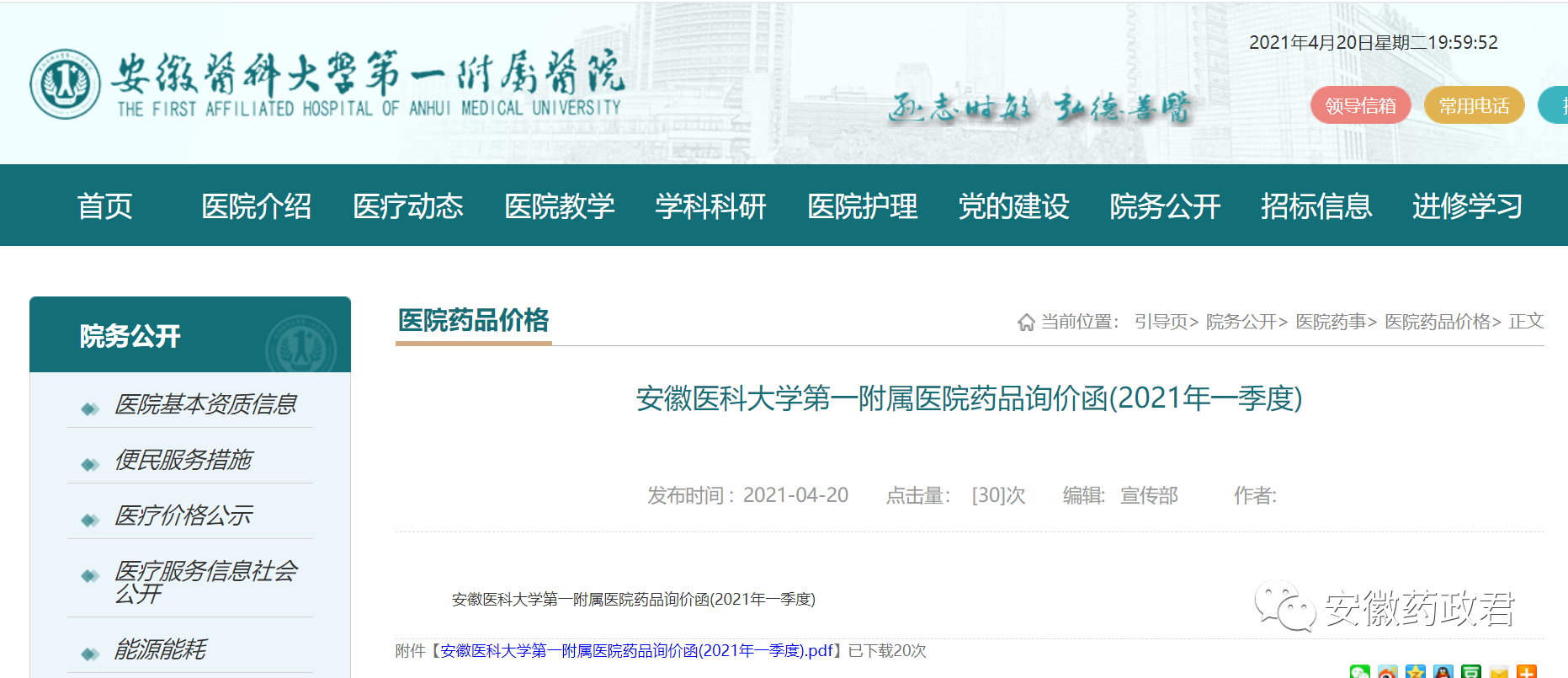 根据药品配送企业及生产企业提出药品调价申请,按照《安徽医科大学第一附属医院药品价格管理制度》、《安徽医科大学第一附属医院临床必需药品更换流程》、《安徽医科大学第一附属医院药品临时配送流程》及《安徽医科大学第一附属医院短缺药品应急采购工作制度》,结合安徽省药品集中招标采购、药品带量采购以及“两票制”配送的相关的要求,拟近期对因价格原因造成临床短缺的20 个常用药品进行公开询价,诚邀与我院有业务关系的各家药品经营公司参与报价。