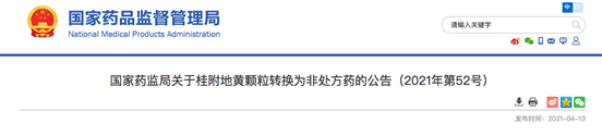 4月13日,国家药品监督管理局发布《关于桂附地黄颗粒转换为非处方药的公告》,根据《处方药与非处方药分类管理办法(试行)》(原国家药品监督管理局令第10号)的规定,经国家药品监督管理局组织论证和审定,桂附地黄颗粒由处方药转化为非处方药。