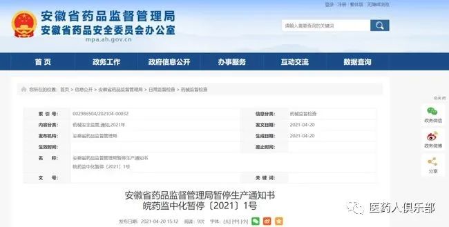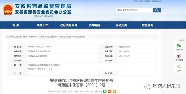 4月20日,安徽省药监局发布两则暂停生产通知书。药监部门在对企业进行飞行检查中,发现2药企存在严重缺陷,药品存在安全隐患。根据《中华人民共和国药品管理法》第九十九条第三款、《药品生产监督管理办法》第五十九条规定,立即暂停生产。