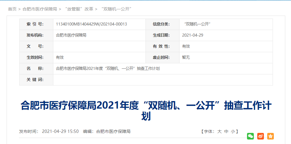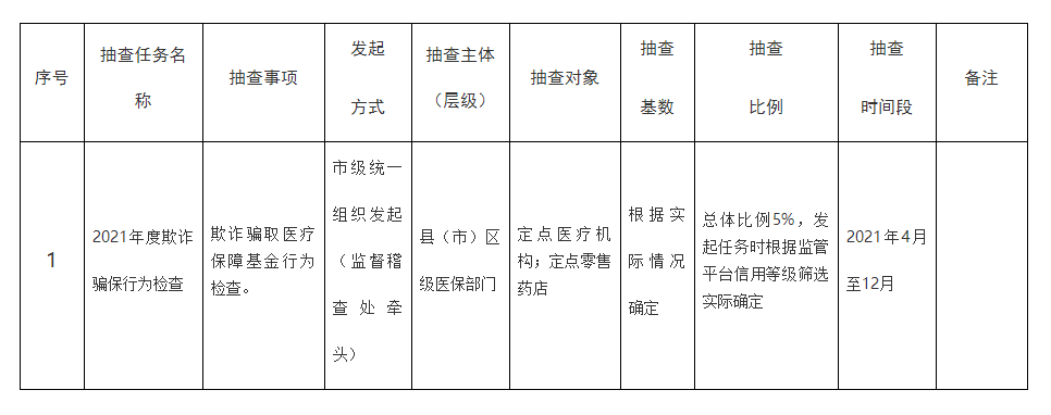 合肥市医疗保障局日前发布2021年度“双随机、一公开”抽查工作计划(以下简称“计划”)。计划显示,从4月到12月,合肥市医疗保障局将在全市范围内开展欺诈骗取医疗保障基金行为检查。
