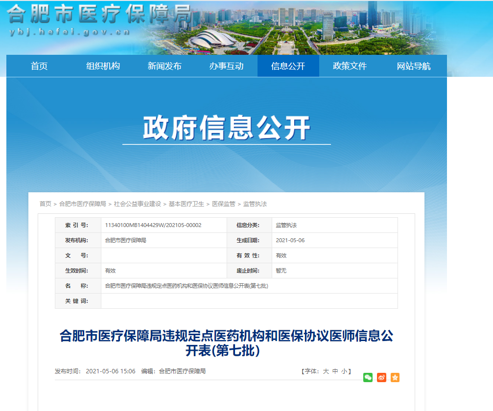 合肥市违规定点医药机构和医保协议医师信息公开表(第七批)