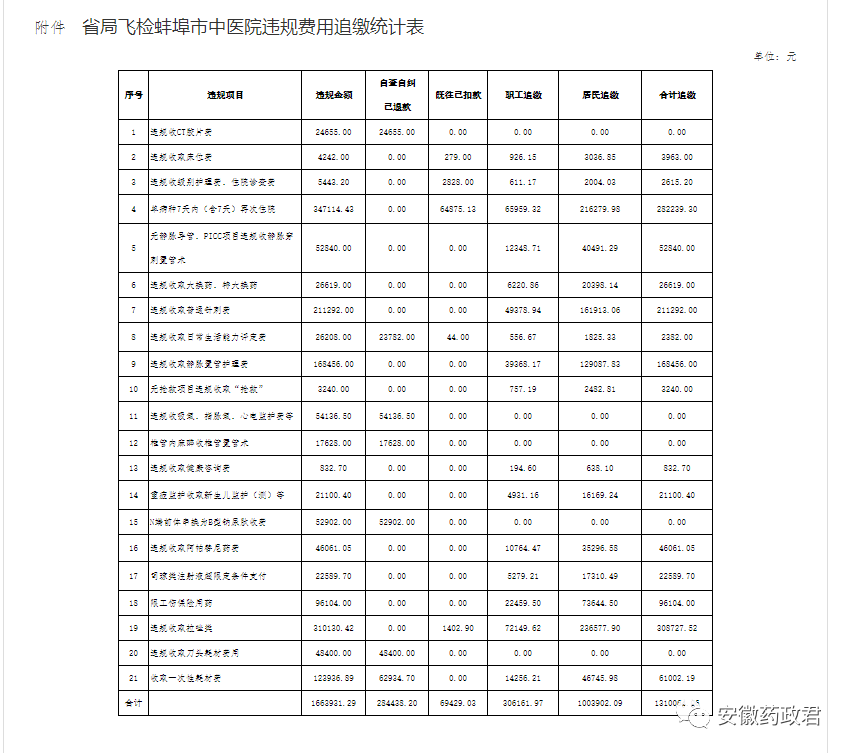 附件:省局飞检蚌埠市中医院违规费用追缴统计表