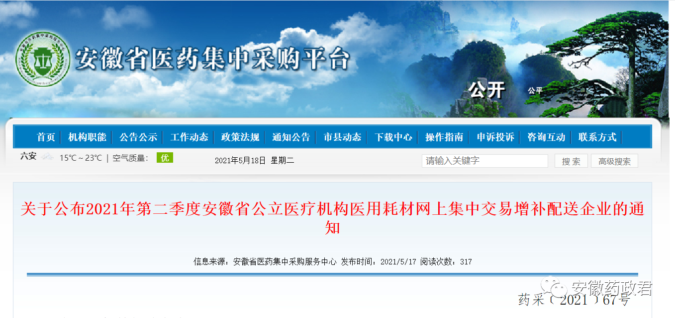 根据《安徽省公立医疗机构医用耗材网上集中交易实施方案(试行)》(皖医改﹝2014﹞1号)要求,经公示后,现将2021年第二季度增补的医用耗材配送企业予以公布(见附件)。