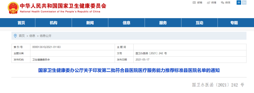 5月17日,国家卫生健康委办公厅发布了《关于印发第二批符合县医院医疗服务能力推荐标准县医院名单的通知》(以下简称“通知”)
