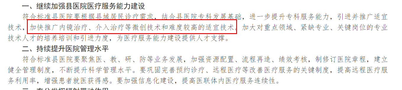再加上国家卫健委开始重视这类治疗技术在各级医院的应用,特别是此次还强调了在县级医院的推广,微创手术器械在我国基层医疗市场或将迎来一波配置潮。在“国产优先”的大环境下,对于国内相关设备厂家来说,无疑是一个利好的机会。