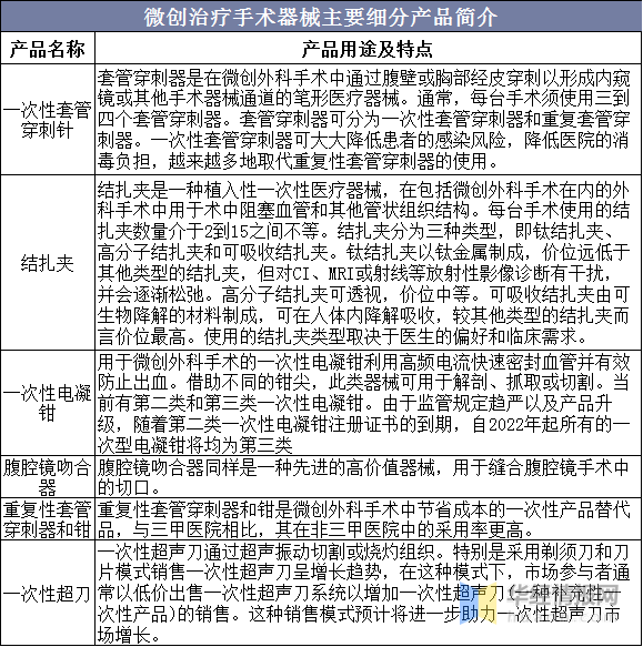 目前微创治疗手术器械设计的产品种类众多,常见的微创治疗手术器械包括一次性套管穿刺针、结扎针、一次性电凝钳等。