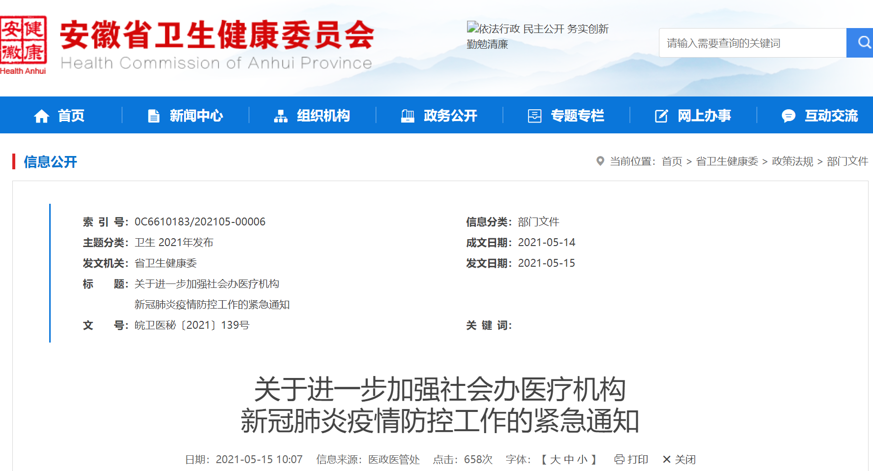 5月15日,安徽省卫生健康委发出关于进一步加强社会办医疗机构新冠肺炎疫情防控工作的紧急通知,明确个体诊所不得接诊、收治发热患者。