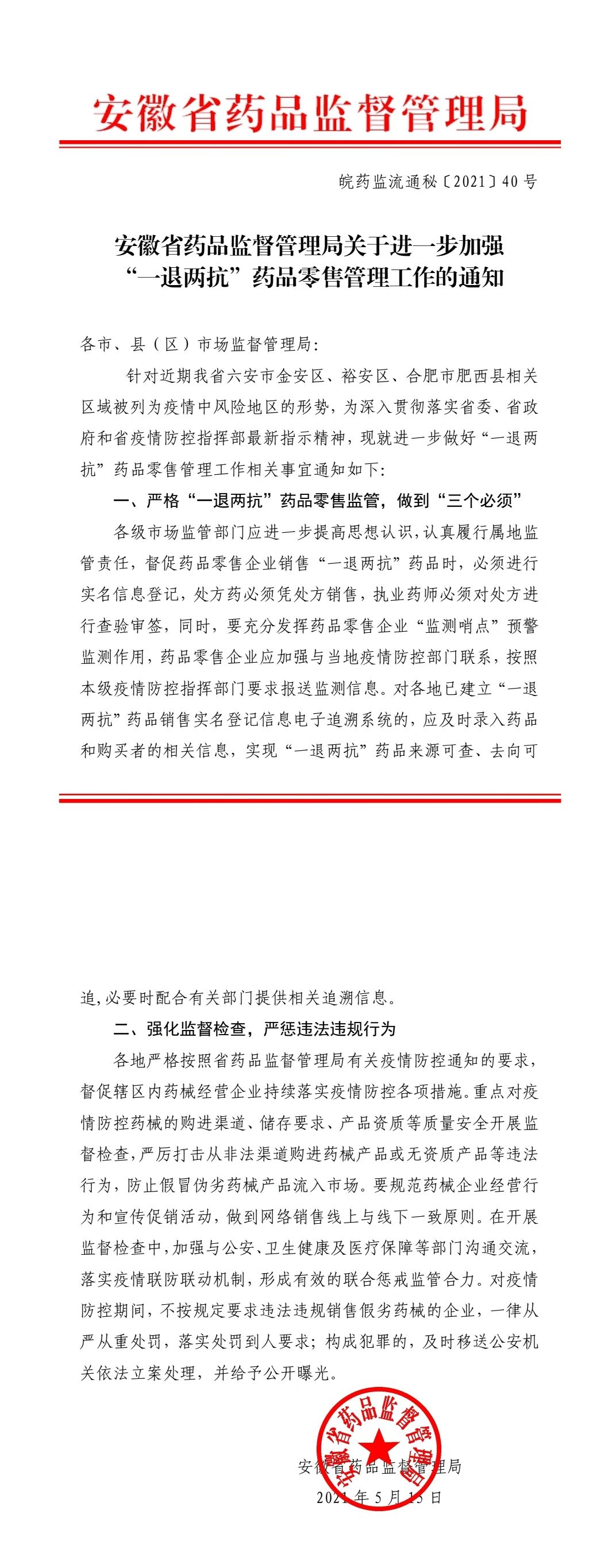5月15日,安徽省药品监督管理局印发《关于进一步加强“一退两抗”药品零售管理工作的通知》(以下简称“《通知》”)。