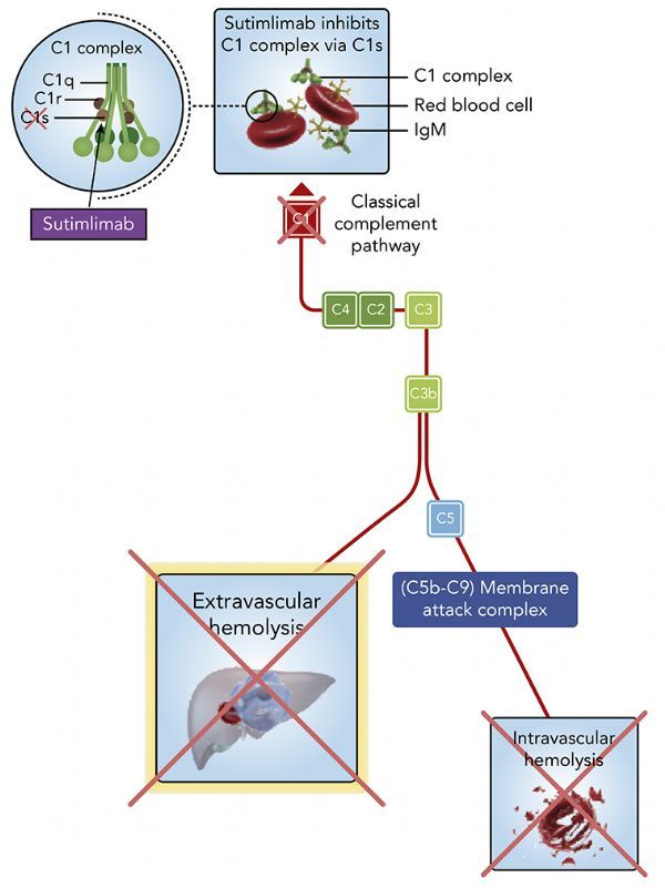 sutimlimab是一种潜在首创、研究性、人源化单克隆抗体,经专门设计用于选择性靶向和抑制C1复合物中的丝氨酸蛋白酶C1s,C1复合物是激活免疫系统经典补体途径的第一步。经典补体途径是先天免疫系统的一部分,其激活是CAD溶血的中心机制。通过靶向抑制C1s,sutimlimab据认为可阻断经典补体途径的激活,从而阻止CAD中的C1激活溶血的发生。
