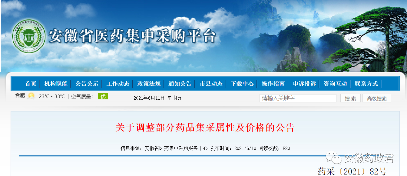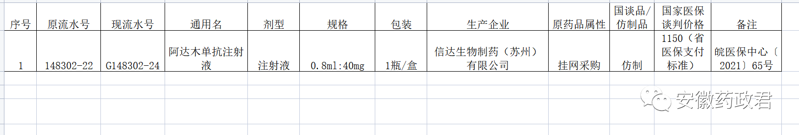 依据国家医保局 人力资源社会保障部《关于印发〈国家基本医疗保险、工伤保险和生育保险药品目录(2020年)〉的通知》(医保发〔2020〕53号)、省医疗保障局 省人力资源和社会保障厅《关于执行〈国家基本医疗保险、工伤保险和生育保险药品目录(2020年)〉的通知》(皖医保秘〔2021〕13号)及省医疗保障局《关于做好协议期内国家谈判准入药品同通用名药品医保支付工作的通知》(皖医保秘〔2021〕16号)要求,为规范医保谈判药品网上集中采购,依据药品生产/代理企业申请,现将相关药品由“挂网采购药品”统一调整为“国家医保谈判药品”(详见附件),并以“国家医保谈判价格”或“省医保支付标准”为集采限价。请各医疗机构及时调整目录及价格。