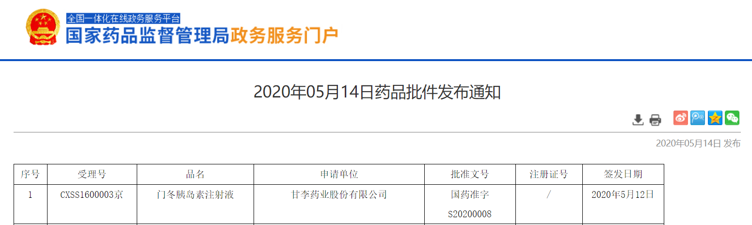 5月14日,甘李药业三代胰岛素类似物门冬胰岛素注射液获得国家药监局批准上市,用于治疗糖尿病。