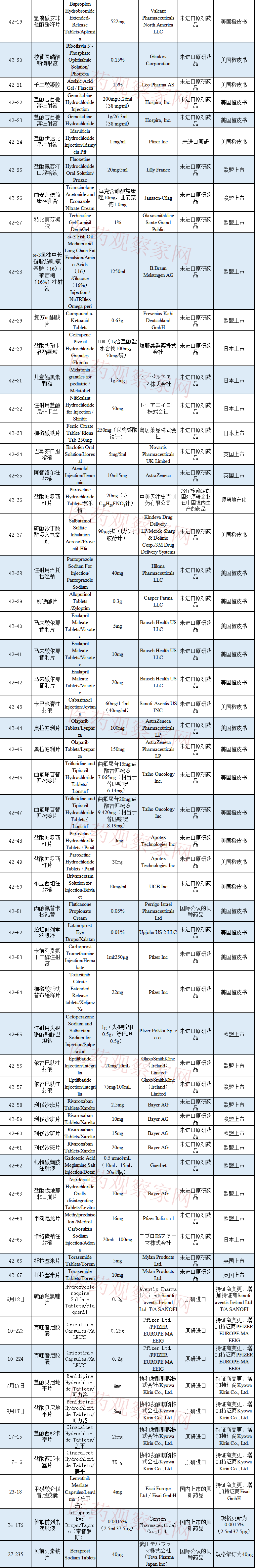 注意:1.目录中所列尚未在国内上市品种的通用名、剂型等,以药典委核准的为准。