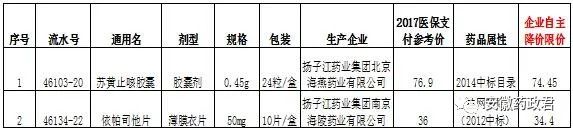 依据国家医保局《关于通报2021年医药垄断控销案源信息的函》(医保价采函〔2021〕49号)要求,根据企业自主申请,现对扬子江药业集团北京海燕药业有限公司及扬子江药业集团南京海陵药业有限公司主动申报相关降价药品统一下调省级集采价格(详见下表),请各医疗机构及时下调相关药品价格。