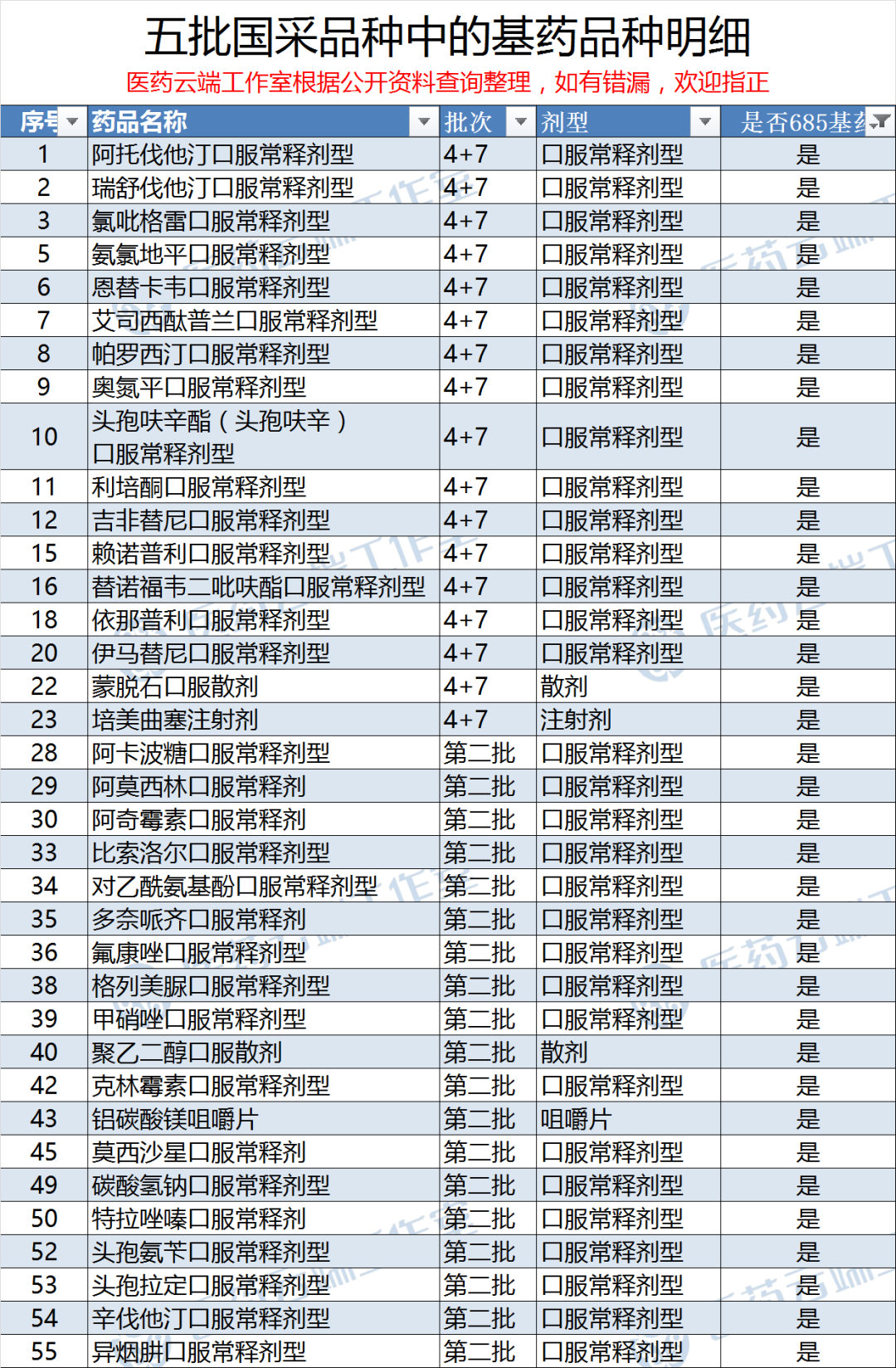 结合合理用药及基药1+X用药模式,未来在公立医疗机构的基药及国采品种更加有优势。事实上,五批六轮国采品种中,超过一半都是基药(如下表所示),这也强化了国采品种进入医院和用药的优势。