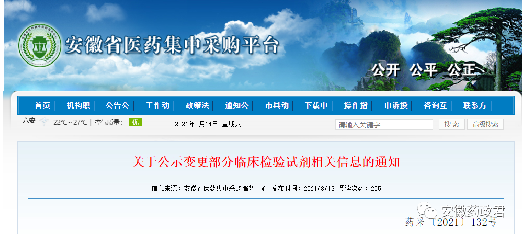 根据《安徽省公立医疗机构临床检验试剂网上集中交易实施方案》(皖卫药〔2017〕55号)规定,由企业提交申请,经审核,现对部分临床检验试剂企业信息和产品信息变更(见附件)进行公示。如有异议,请于公示期内递交书面申投诉材料至安徽省医药集中采购服务中心咨询室;如无异议,公示期满后予以变更。信息变更后,企业履行的责任和义务不变。