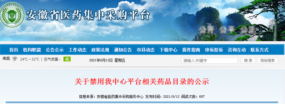 8月12日,安徽省医药集中采购服务中心发布《关于禁用我中心平台相关药品目录的公示》,对药品交易和招标系统部分注销批准文号及重复申报药品目录予以禁用。