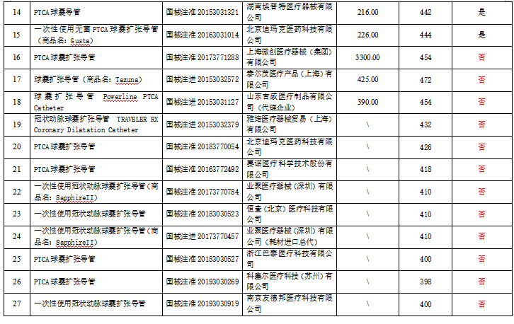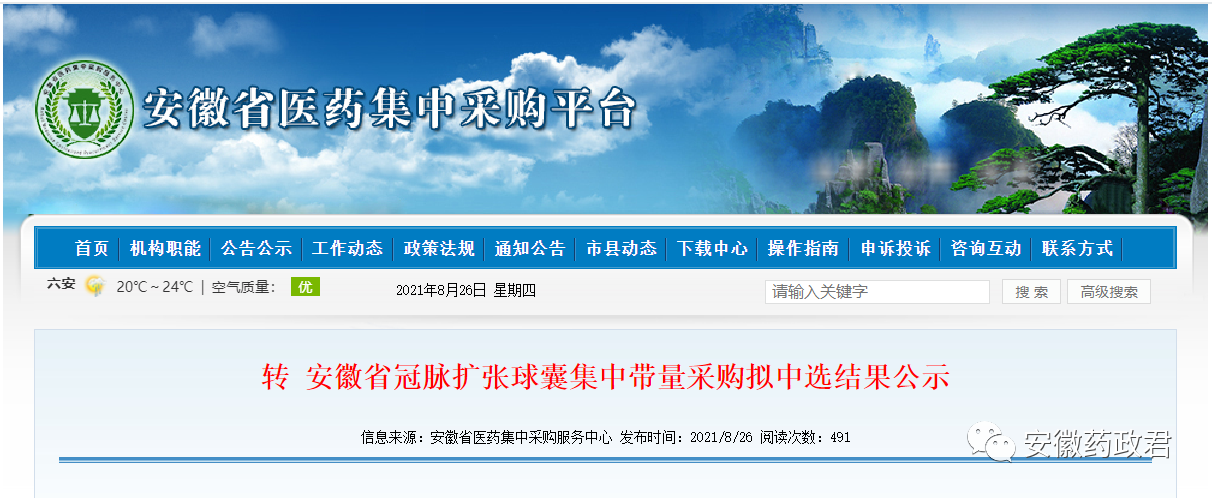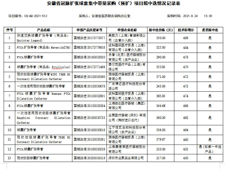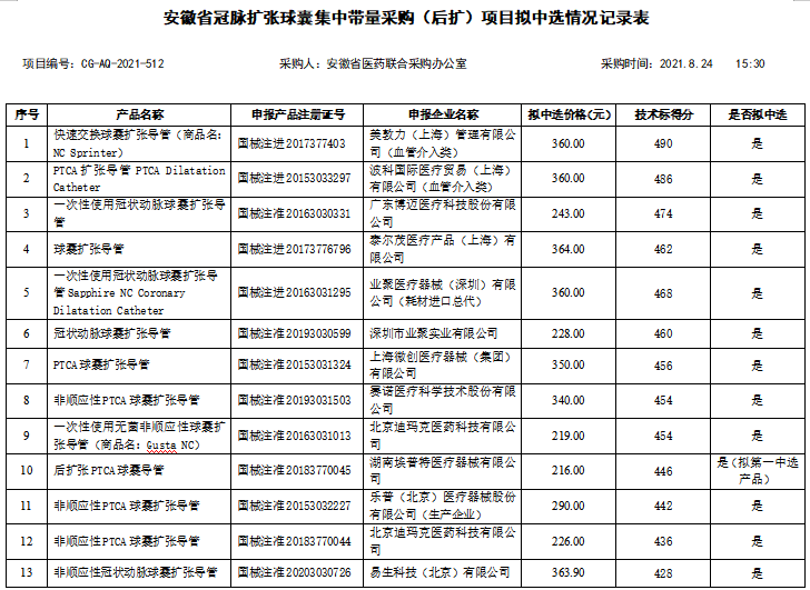 安徽省冠脉扩张球囊集中带量采购拟中选结果公示
