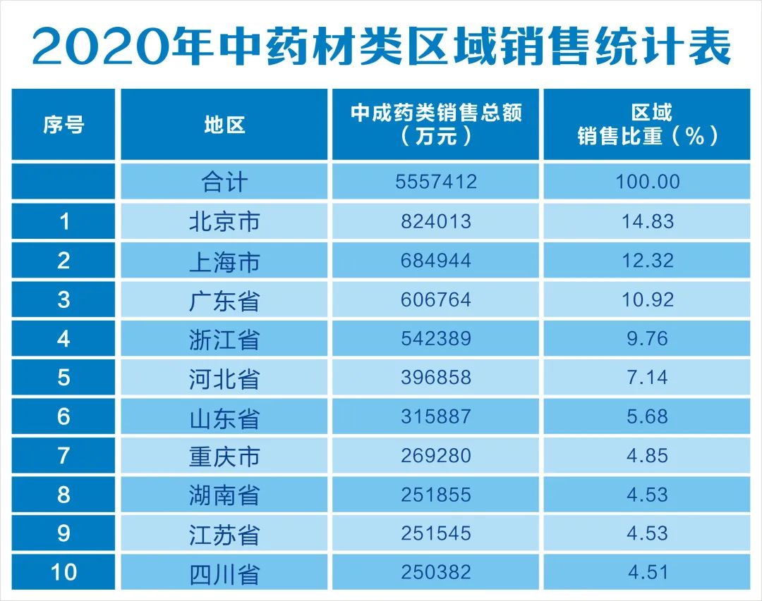 这十个省中医药销售最强! 2020 年是全国药品流通行业“十三五”发展规划的收官之年。面对突如其来的新冠肺炎疫情,药品流通行业经受住了考验,有力地保障了药品及医疗防疫物资的高效流通和可靠供应,为抗击疫情做出了积极贡献。 随着医药卫生体制改革不断深化,药品流通行业加快转型升级步伐,行业销售总额稳中有升,集约化程度继续提高,持续保持稳中向好态势。从商务部给出的数据统计上可以看出,北上广这类经济文化高度发展的地区人民对于中医药的接受程度普遍偏高。 2020年中成药类区域销售额居前10位的省市自治区依次为:广东、北京、江苏、上海、浙江、河南、山东、重庆、安徽、四川;上述省市销售额占全国销售总额的64.3%。 2020年中药材类区域销售额居前10位的省市自治区依次为:北京、上海、广东。浙江。河北、山东、重庆、湖南、江苏、四川;上述省市销售额占全国销售总额的79.07%。 中药类销售额占比不足20% 2020年,随着全国药品流通市场销售规模稳步扩大,西药、中成药、中药材等七大类医药商品销售总额24149亿元,扣除不可比因素同比增长2.4%,其中,药品零售市场5119亿元,扣除不可比因素同比增长10.1%,增速同比加快0.2个百分点。 可按照商务部最新发布的数据显示,2020年中成药类销售占比为14.14%,中药材类销售占比为2.30%。值得注意的是,在七大类医药商品里中成药、中成药占比均持续下降,,远落后于西药类销售总额。 2020年,全国中成药类区域销售总额为34138974万元,中药材类销售总额为5557412万元,在全国31省市自治区中,西藏自治区的中成药销售额远高于当地的西药类销售,占比高达80.39%。 《2020年药品流通行业运行统计分析报告》是时隔3年后,商务部再次发布药品流通报告。从商务部给出的数字中,三年来中药类的销售额持续走低,竟然比西药类足足低出三倍有余!在国家大力推进中医药行业发展的当下,这个对比让许多业内人士汗颜。