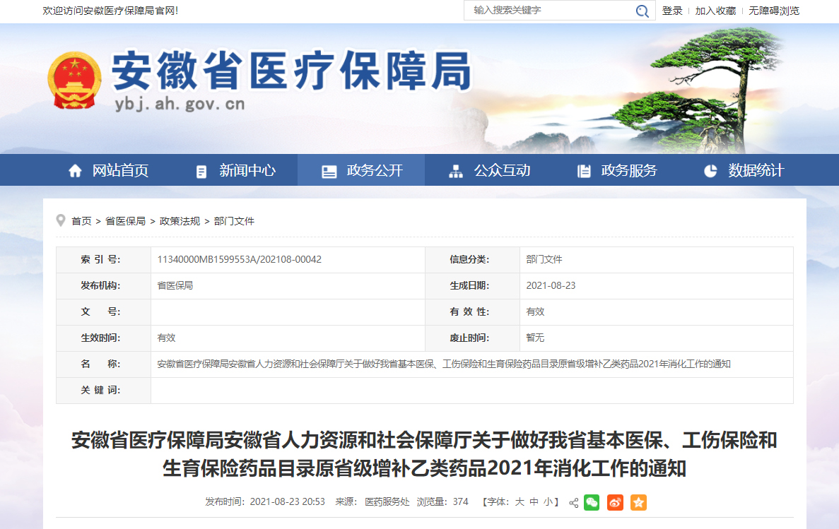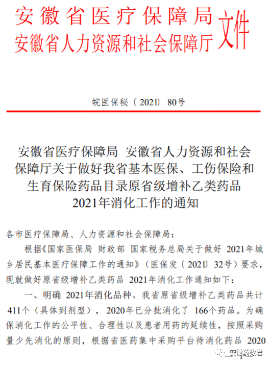 安徽省医疗保障局安徽省人力资源和社会保障厅关于做好我省基本医保、工伤保险和生育保险药品目录原省级增补乙类药品2021年消化工作的通知