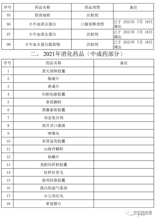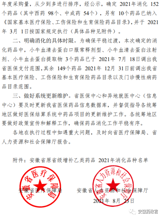 二、明确消化的具体时限。为确保平稳过渡,本次确定的消化药品中,小牛血清去蛋白口服常释剂型、小牛血清去蛋白注射剂、小牛血去蛋白提取物3个药品已于2021年7月18日调出我省医保支付范围,其余149个药品2021年12月31日前调出我省基本医疗保险、工伤保险和生育保险药品目录以及门诊慢性病药品目录范围。