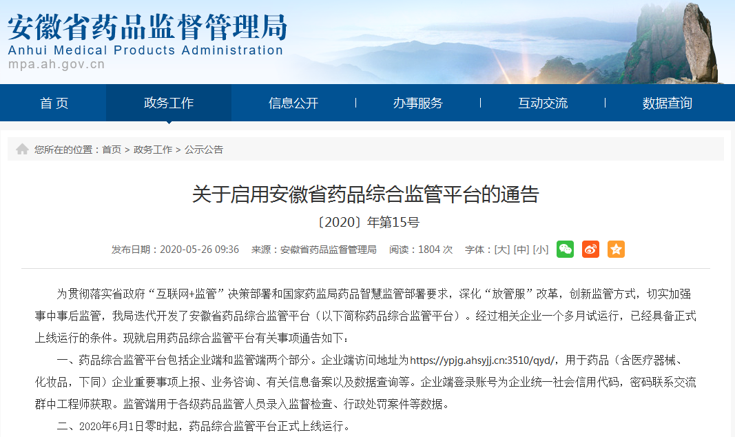 为贯彻落实安徽省政府“互联网+监管”决策部署和国家药监局药品智慧监管部署要求,深化“放管服”改革,创新监管方式,切实加强事中事后监管,安徽省药监局迭代开发了安徽省药品综合监管平台(以下简称“药品综合监管平台”)。经过相关企业一个多月试运行,已经具备正式上线运行的条件。