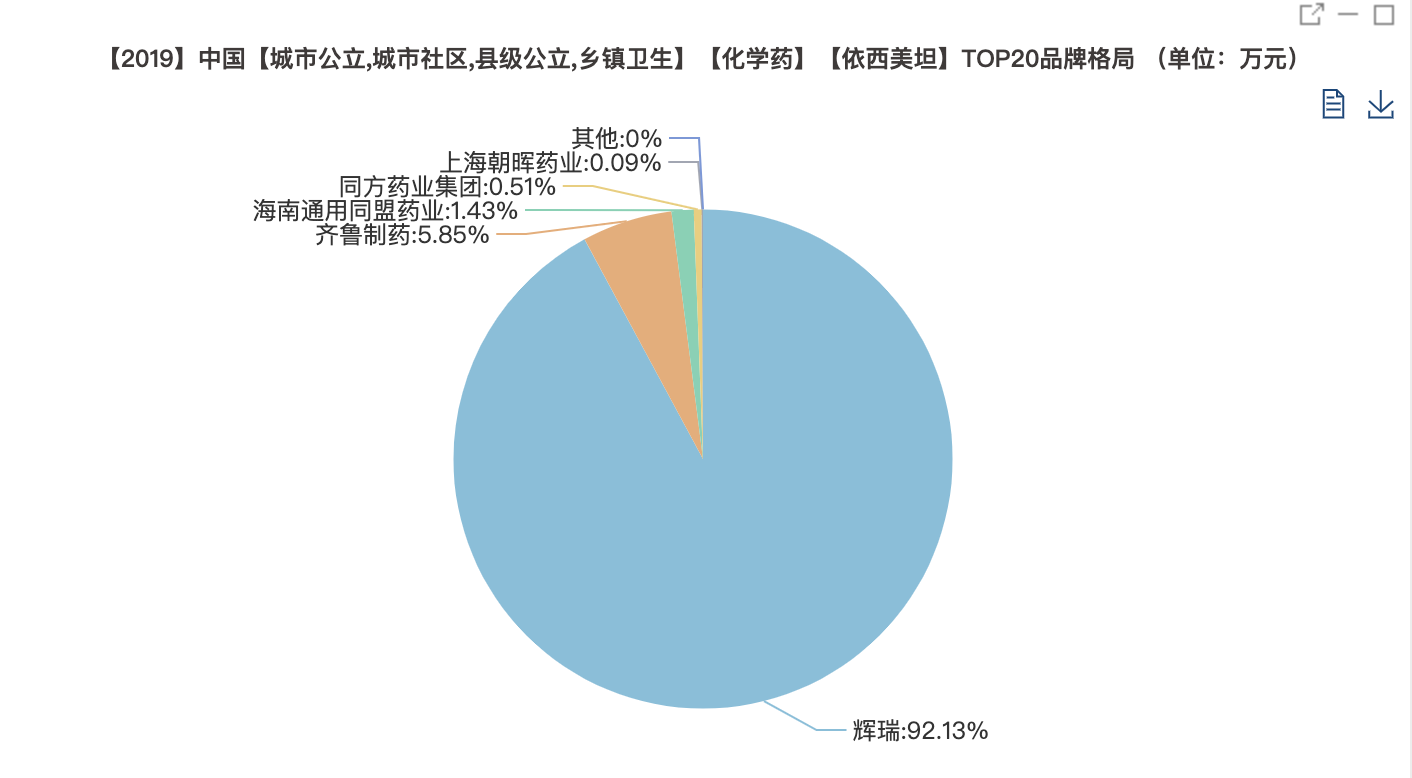 米内网数据库显示,2019年中国公立医疗机构终端依西美坦片销售额为9.08亿元。2019年中国公立医疗机构终端厂家竞争格局中,原研厂家辉瑞依然占据绝对的市场份额,高达92.13%。