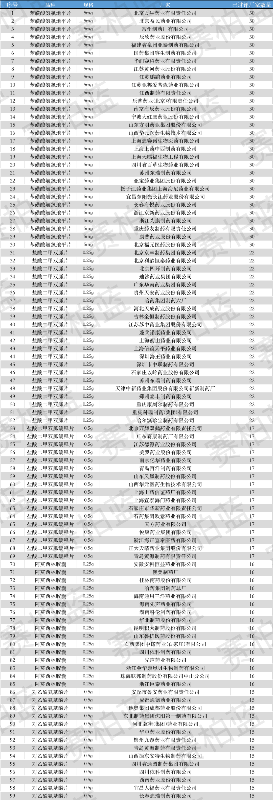 比如苯磺酸氨氯地平片(5mg)已过评厂家数量达28家;盐酸二甲双胍片(0.25g)已有21家厂家过一致性评价,在负担过评费用的同时,竞争也进一步加剧。