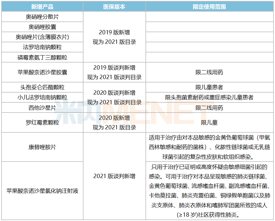 表2:2019-2021年国家医保新增及谈判新增的全身用抗细菌药