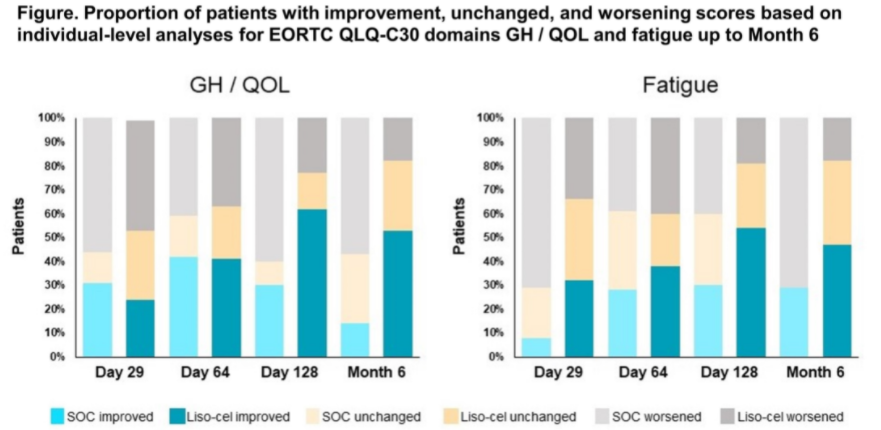 同样,本届ASH大会公布的TRANSFORM研究患者报告结果(PRO)显示(摘要#3845),随机分组后128天时,liso-cel组患者较SOC组生活质量评分(EORTC QLQ-C30总体健康状况/生活质量领域及疲劳领域)较基线水平显著改善。