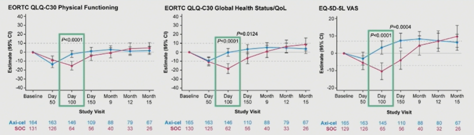 此外,本次ASH大会公布的ZUMA-7研究患者报告结果(Patient-Reported Outcomes)显示,随机分组开始100天时, axi-cel组患者相比SOC组的生活质量(QoL)在多个维度上较基线显著改善,包括EORTC QLQ-C30躯体功能评分、EORTC QLQ-C30总体健康状况/生活质量评分、EQ-5D-5L视觉模拟量表等。