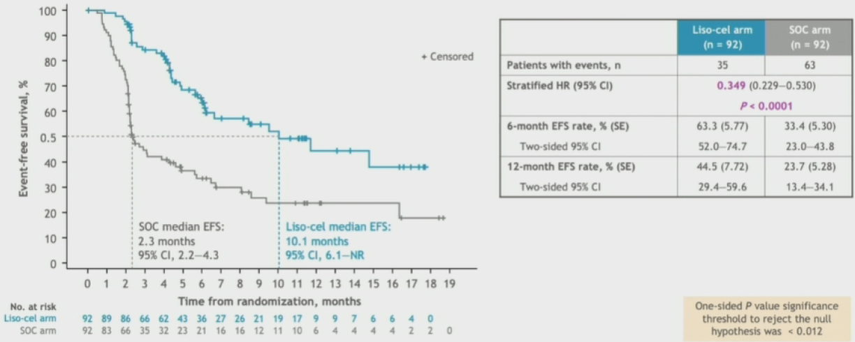中位随访6.2个月,liso-cel组患者中位EFS相比SOC组显著提高:10.1月 vs 2.3月,HR为0.349(95%CI 0.229-0.530,p<0.0001)。