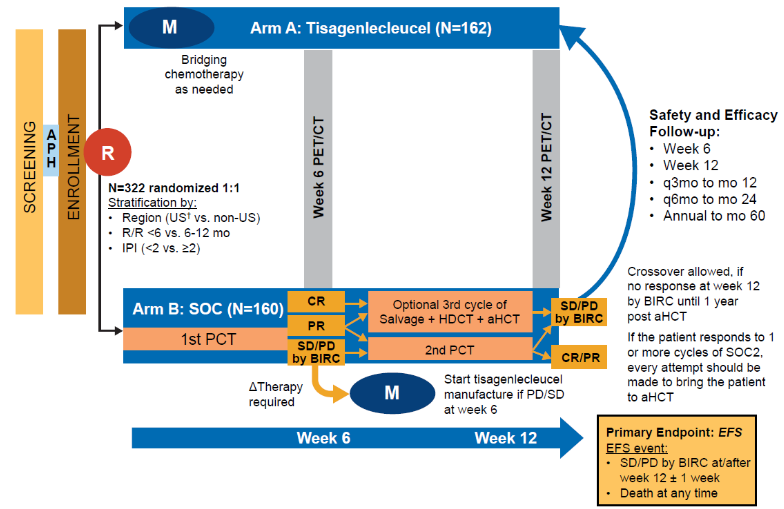 试验组:liso-cel(允许桥接治疗,方案为预定的SOC组挽救化疗方案)
