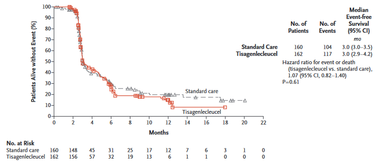 中位随访10.0个月,Tisagenlecleucel组相比SOC组中位EFS未见显著差异:3.0月 vs3.0月,HR为1.07(95%CI 0.82-1.04,p=0.61)。