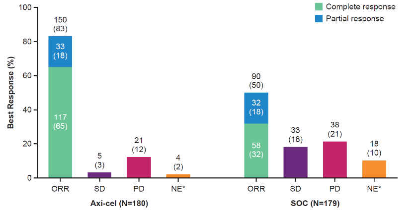 安全性方面,axi-cel和SOC组≥3级AEs发生率分别为91%和83%,axi-cel组≥3级细胞因子释放综合征(CRS)和神经事件(NE)发生率分别为6% 和21%。