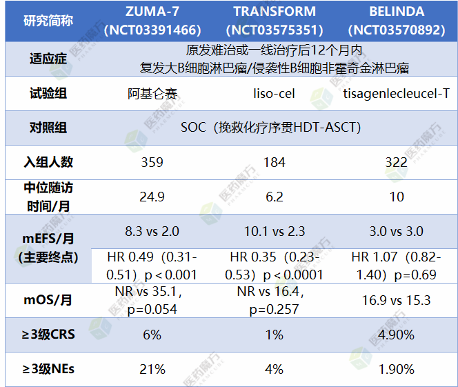 至此,全球三项CAR-T细胞疗法对比标准治疗方案(SOC)二线治疗复发/难治淋巴瘤的3期临床研究初步结果均已公布,TRANSFORM和ZUMA-7研究均达到预定主要终点,BELINDA研究则遗憾宣告失败。其中,BELINDA和ZUMA-7同步发表在顶级期刊新英格兰医学杂志(NEJM)。