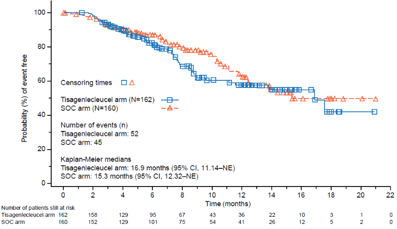 安全性方面,Tisagenlecleucel组和SOC组≥3级AEs发生率分别为84.0%和90.0%,Tisagenlecleucel组≥3级CRS和NE发生率分别为4.9% 和1.9%。
