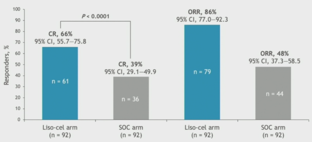 安全性方面,liso-cel和SOC组≥3级AEs发生率分别为92%和87%,liso-cel组≥3级CRS和NE发生率分别为1% 和4%。