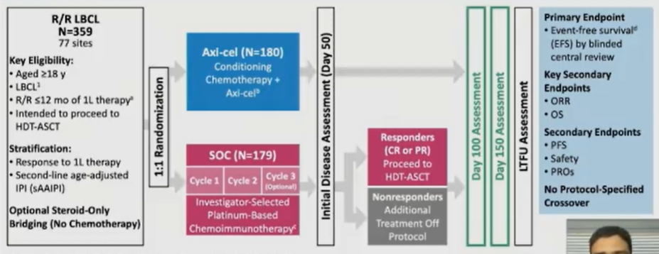 阿基仑赛二线治疗复发/难治性LBCL的3期试验(ZUMA-7)是一项全球多中心、随机、开放标签的3期研究,研究设计如下:
