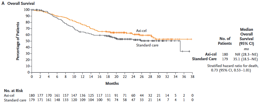 关键次要终点方面,axi-cel组ORR显著高于SOC组:83% vs 50%(p<0.001),但中位OS两组未见显著差异:NR vs 35.1月,HR为0.73(95%CI:0.53-1.01,p=0.054)。