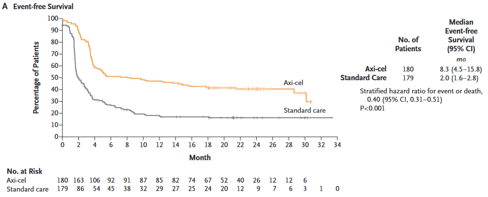 中位随访24.9月,axi-cel组患者中位EFS相比SOC组显著提高:8.3月 vs 2.0月,HR为0.40(95%CI 0.31-0.51,p<0.001 )。