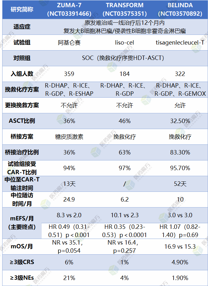 BELINDA、TRANSFORM和ZUMA-7研究预先确定的挽救化疗方案基本相同,但BELINDA研究允许第6周PET-CT评估缓解不充分的患者调整治疗方案,最终SOC组和试验组中分别有54%和12%中的患者接受第二种化疗方案,但最终三项研究的对照组经挽救治疗达CR/PR后接受ASCT的患者比例基本相似(BELINDA:32.5%;TRANSFOR:46%, ZUMA-7:36%),这从侧面反映BELINDA研究中患者疾病风险更高[4]。