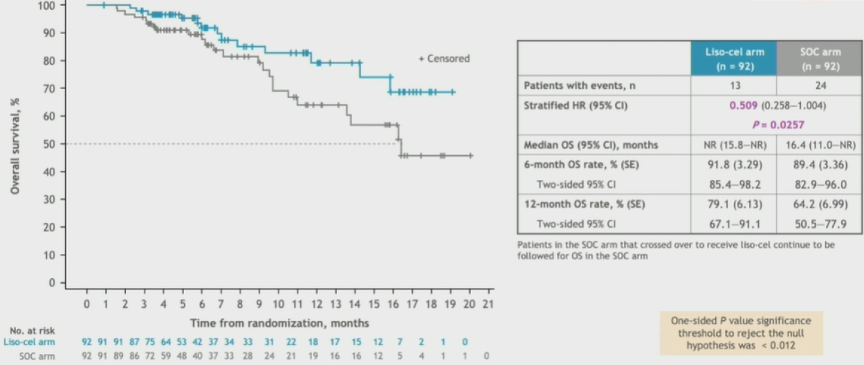 关键次要终点方面,liso-cel组患者CR率显著高于SOC组:66% vs39%(p<0.0001),liso-cel组中位OS同样显著升高:NRvs 16.4月,HR为0.509(95%CI 0.258-1.004,p=0.0257).