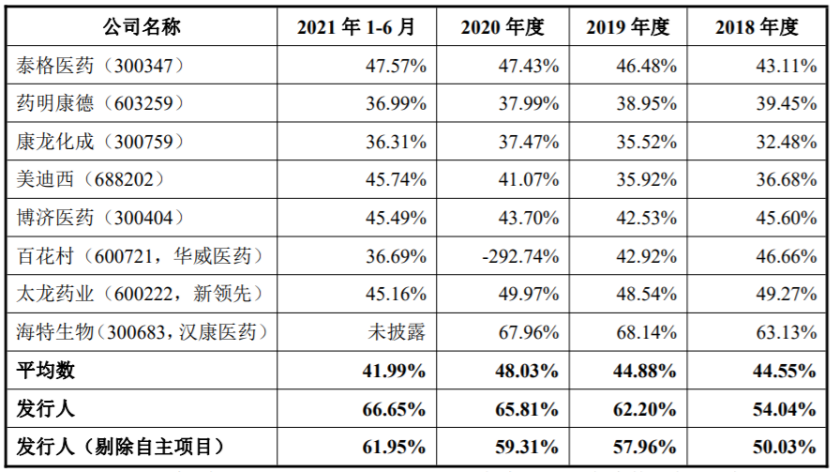 2018-2021年上半年,百诚医药主营业业务毛利率分别为54.04%、62.2%、65.81%、66.65%,而药明康德同期毛利率为39.45%、38.95%、37.99%、36.99%,同业可比公司同期毛利率均值44.55%、44.88%、48.03%、41.99%。
