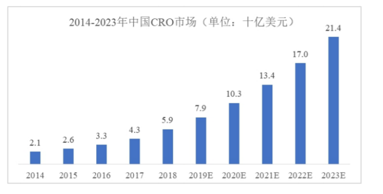 数据显示,我国CRO市场规模由2014年的21亿美元增长至 2018年的59亿美元,2014年-2018年年均复合增速为29.2%。预计到 2023年将增长至214亿美元,2018年-2023年年均复合增速约为29.6%。