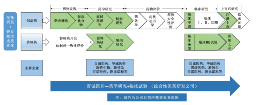 CRO企业的业务环节包括药物发现、药学研究、临床前研究、临床研究、受托研究。以药明康德、康龙化成为代表的全面综合性CRO,业务范围涵盖所有环节,而百诚医药、阳光诺和、博济医药、华威医药等企业所提供的CRO服务主要在仿制药领域,一般只提供仿制药开发、一致性评价所需的药学研究、临床试验等综合服务。