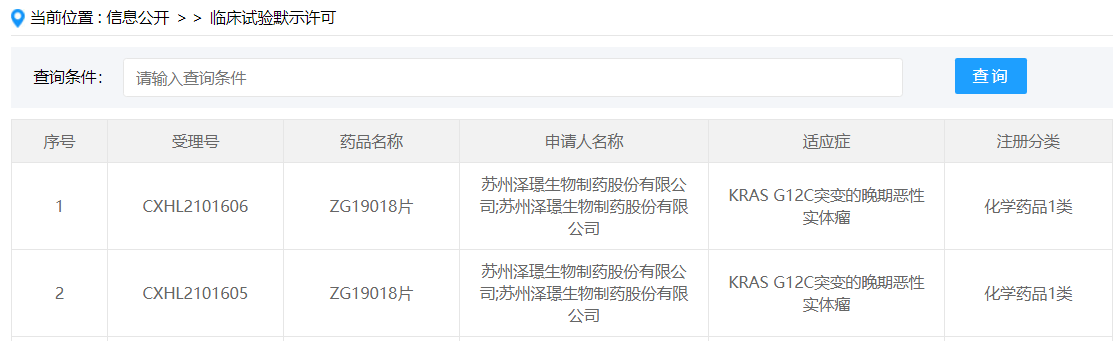 12月27日,CDE官网显示,泽璟制药ZG19018片的临床试验申请获批,用于治疗KRAS G12C突变的晚期恶性实体瘤。