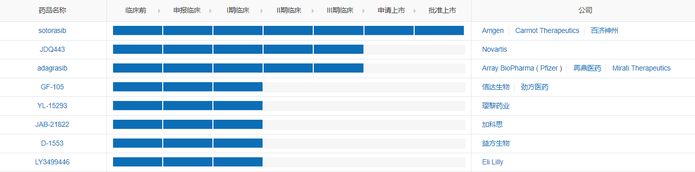 除Sotorasib外,进展较快的还有诺华的JDQ443和Mirati的adagrasib,均处于临床III期阶段。值得一提的是,今年6月,再鼎医药以3.38亿美元的价格获得在大中华区研究、开发、生产及独家商业化adagrasib的权利。国内,信达生物/劲方医药、璎黎药业、加科思、益方生物、贝达药业等企业也都在努力开发KRAS抑制剂。