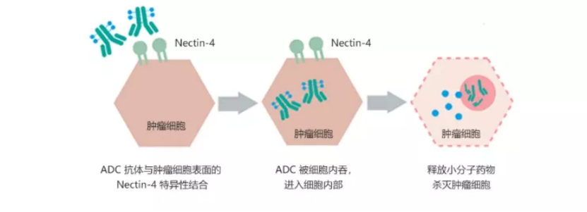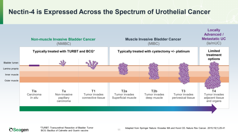 Nectin-4(基因名为PVRL4,脊髓灰质炎病毒受体4)作为一种I型膜蛋白,只特异性表达于胚胎,胎盘以及肿瘤细胞中;尿路上皮癌细胞上高表达,部分乳腺癌、肺癌、胃癌、头颈癌上高表达,通过激活P13K/Akt通路促进肿瘤的增殖和迁移。基于靶点的分布特点,Seagen/安斯泰来选择从晚期尿路上皮癌入手,稳扎稳打,从晚期后线逐步向前线推进,并拓展到疾病的早期阶段——MIBC与NMIBC。