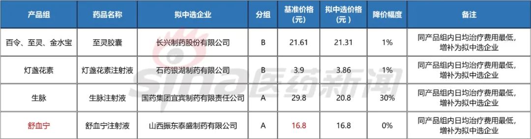 如下表所示,因为同产品组内日均治疗费用最低,增补为拟中选企业的四个产品,除了国药集团宜宾制药有限责任公司降30%,其余降价都是1%(含以下)。这规则实际上给了降无可降,但价格是同产品组内日均治疗费用最低的产品一条活路。